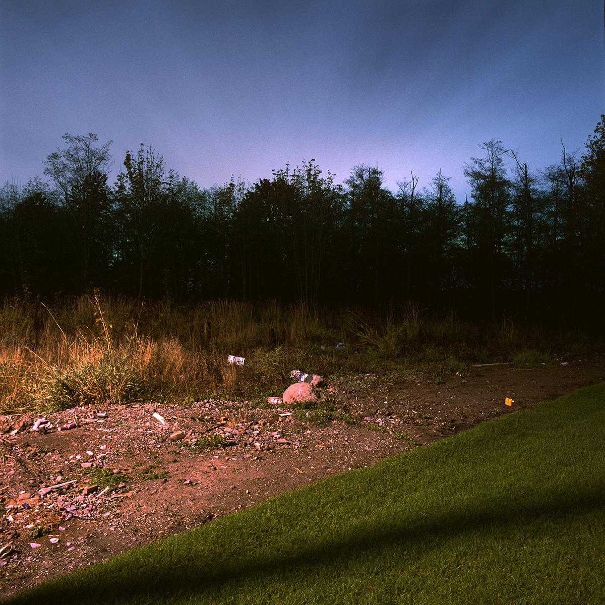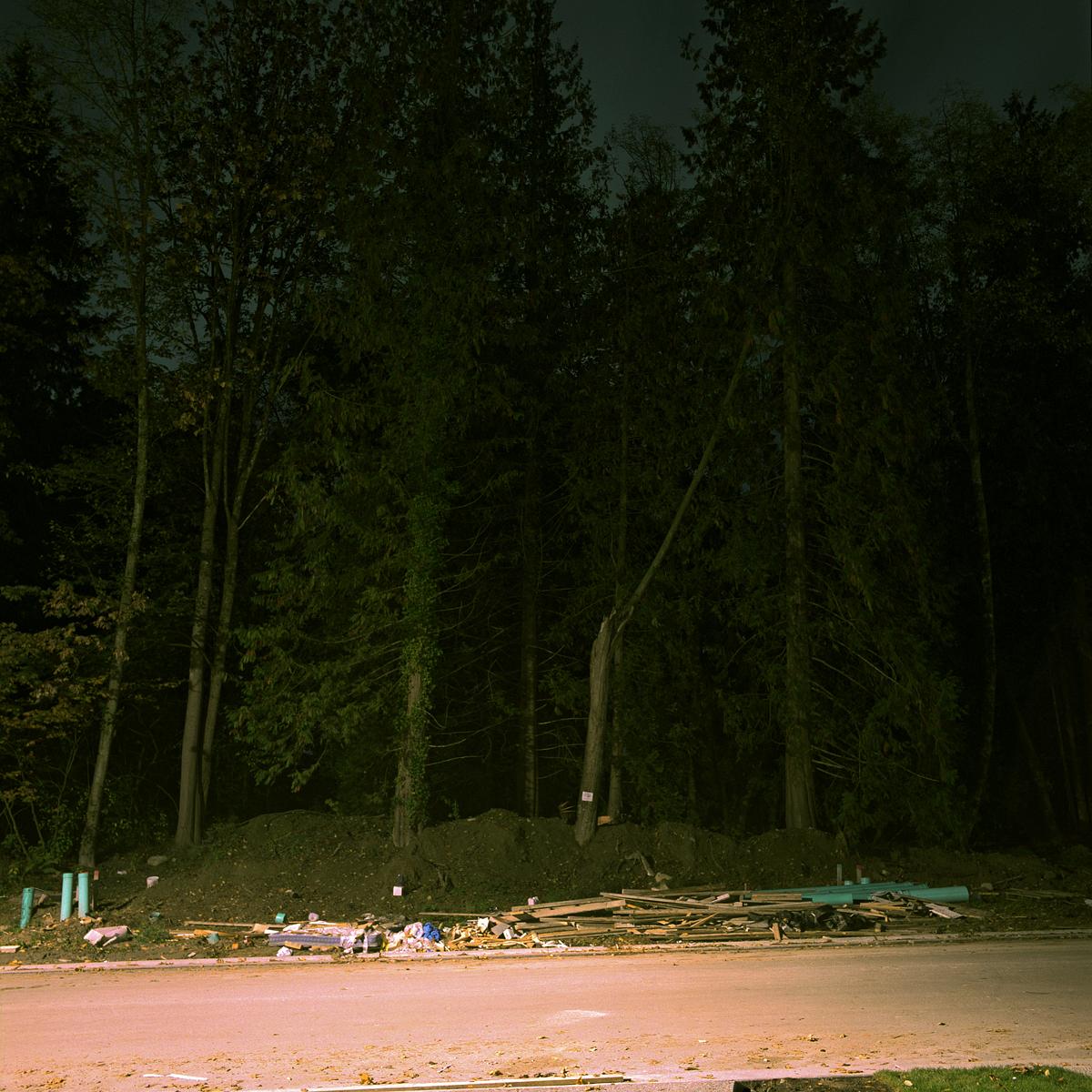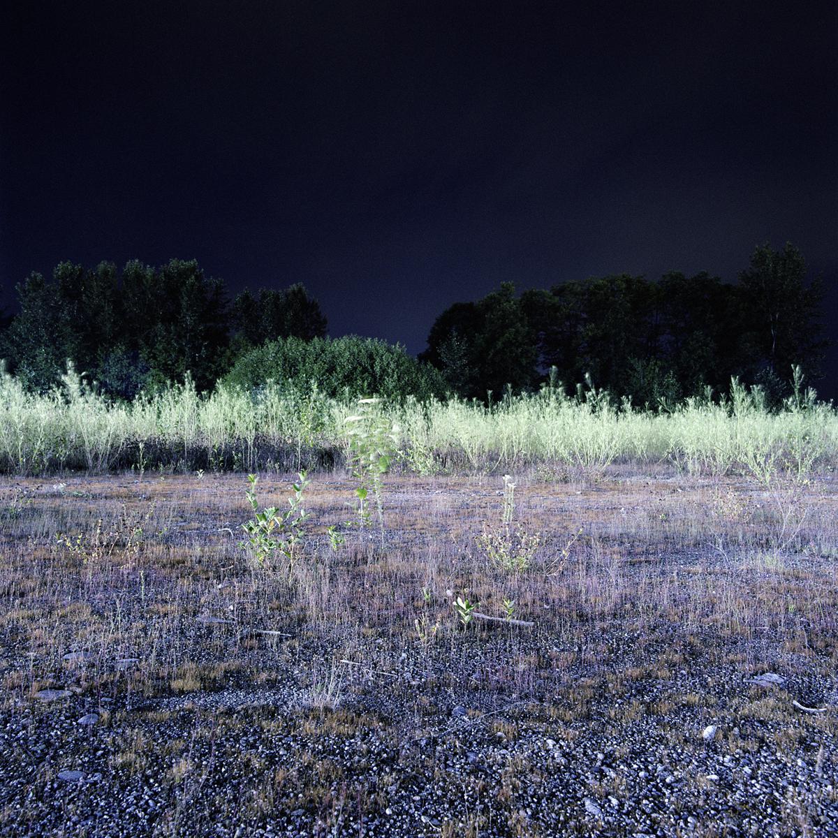 All of the work in the on going series Crepuscule is photographed at night using available ambient light. It is under cover of darkness that I am able to document locations where the natural landscape is illuminated by artificial light from various sources. These locations exist primarily in areas of contained, sparse, or fringe development, where the boundary between the natural landscape and human settlement is fraught with tension.